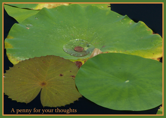 While at Disney’s Epcot Center a few years ago I took this photo near the China pavillion. Someone had tossed a penny into the pond only to have it land in the wet center of a waterlilly. I hope they got their wish, and may your wishes come true as well today.