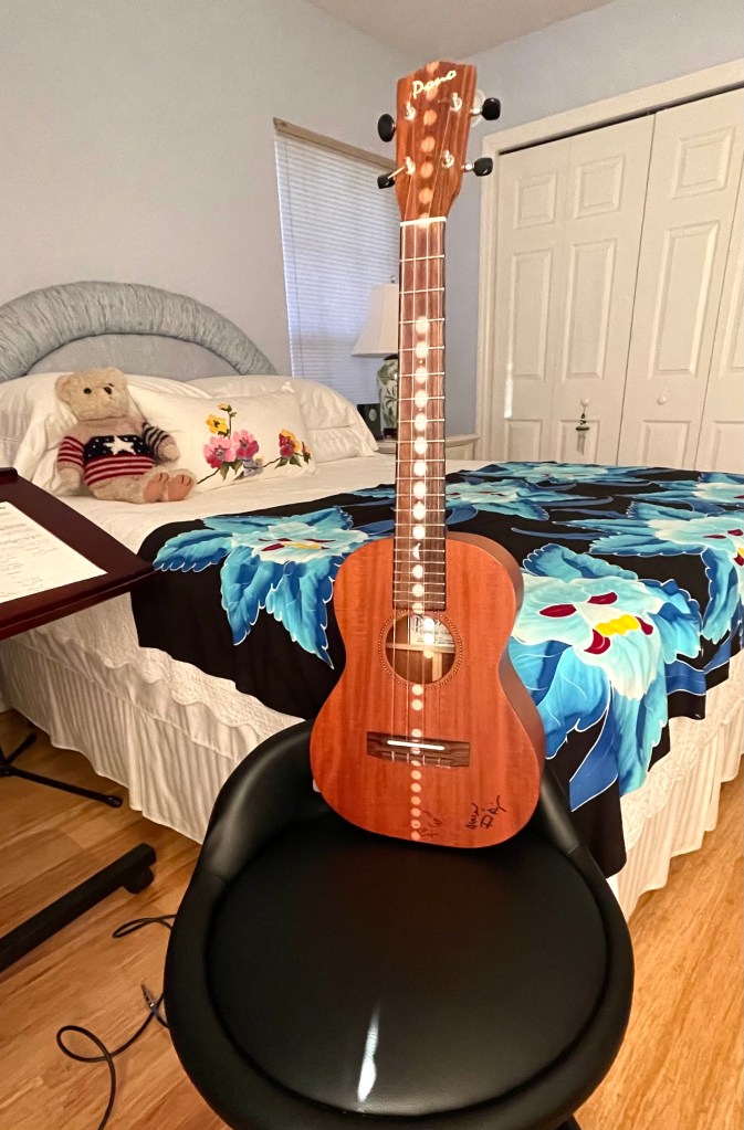 Yesterday after I closed the blinds, I noticed pearly beads of light projected through slits in the shades in the music room. I positioned my favorite ukulele, a Pono tenor, and took this photo. It seems a good omen for happy holidays. To see it in action see https://www.youtube.com/watch?v=HuJ40fU_NkI