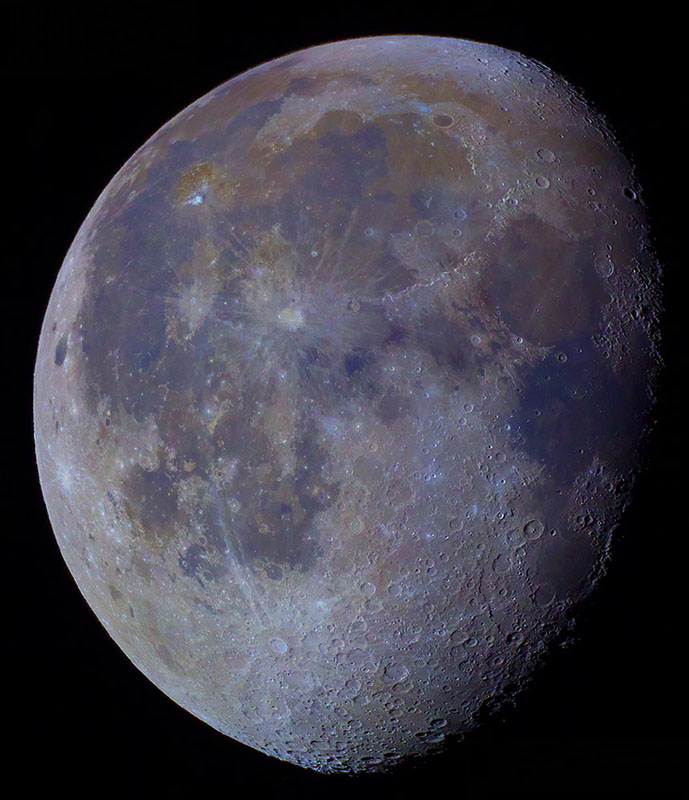 Believe it or not, there is color variation across the face of our Moon as shown by this color-enhanced photo. The various colors reflect the varying mineral composition of its surface and give clues to relative ages of some of the features. .