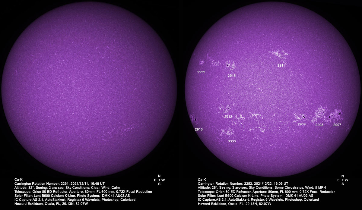 The dark spots reside in dense, twisted magnetic fields revealed as the bright areas or “plages” around the dark spots. These spot-containing areas are known as “active regions” and are numbered by NOAA as noted above. The ones with “????” notation have not yet received a number, but likely will in the next day or two. Spots often pop up overnight and usually last a few days to a week or two before disappearing, but rare ones may persist for over a month.
