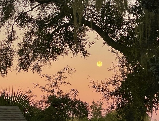 Chilly air colored by the dawning sun filtered the light from the setting full Moon as it peered between the branches of a live oak behind our yard. While leaves are falling in the front yard as our maple sheds its leaves, the live oak wait for spring for their leaves to fall. The seasons seem a little mixed up here in Florida but the Moon still smiles through it all
