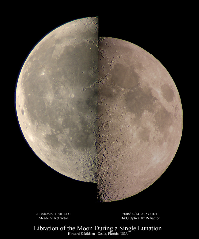 Due to the tilt of the Moon’s orbit, it nods north and south during its circuit around Earth allowing us to see a little more of the Moon’s surface than if didn’t tilt. In this case the maximum nodding, or “libration” corresponded with the first and the last quarter of the Moon. The two photos were combined at three notable craters near the center, Ptolemaeus, Alphonsus, and Arzachel, to show the extent of the Moon’s libraton. Strange how it wobbles and nods as if it has had too much libation!