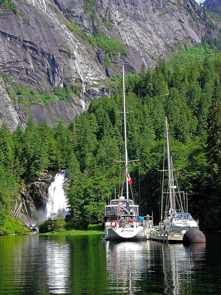 Chatterbox Falls is located at the end of a timeless fjord known as Princess Louisa Inlet in British Columbia. Its waters cascade from steep cliffs to make a final 80 foot plunge into seawater just beyond the docks in this photo. The entrance to the inlet is guarded by insanely dizzying tidal rapids that yield passage to boats only for 15-20 minutes a few times each day as the surging tidal waters hesitate while changing direction of flow.