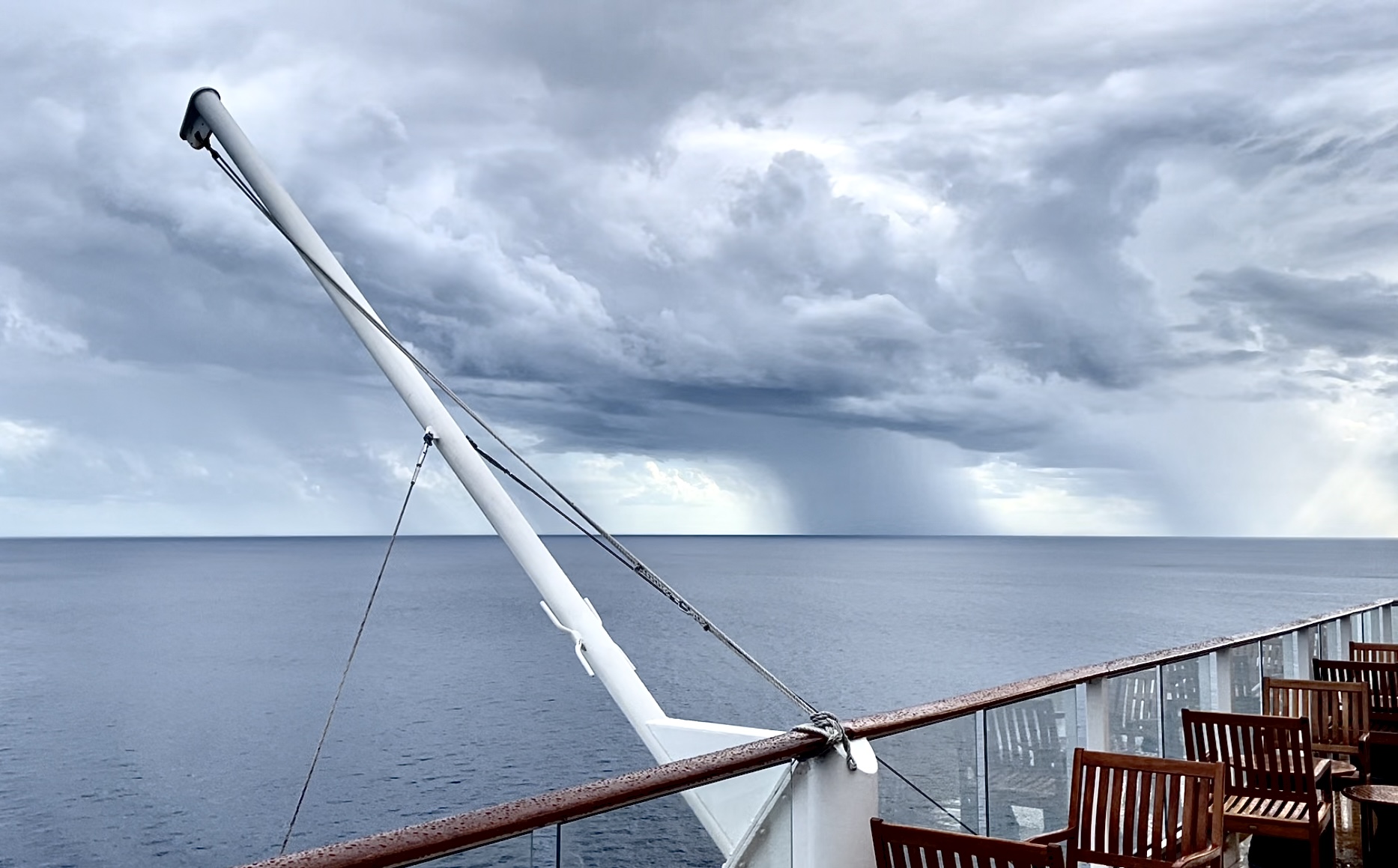 Gray clouds drop showers upon a dark, tranquil sea in the gulf stream waters between Cuba and Florida during our last day at sea.