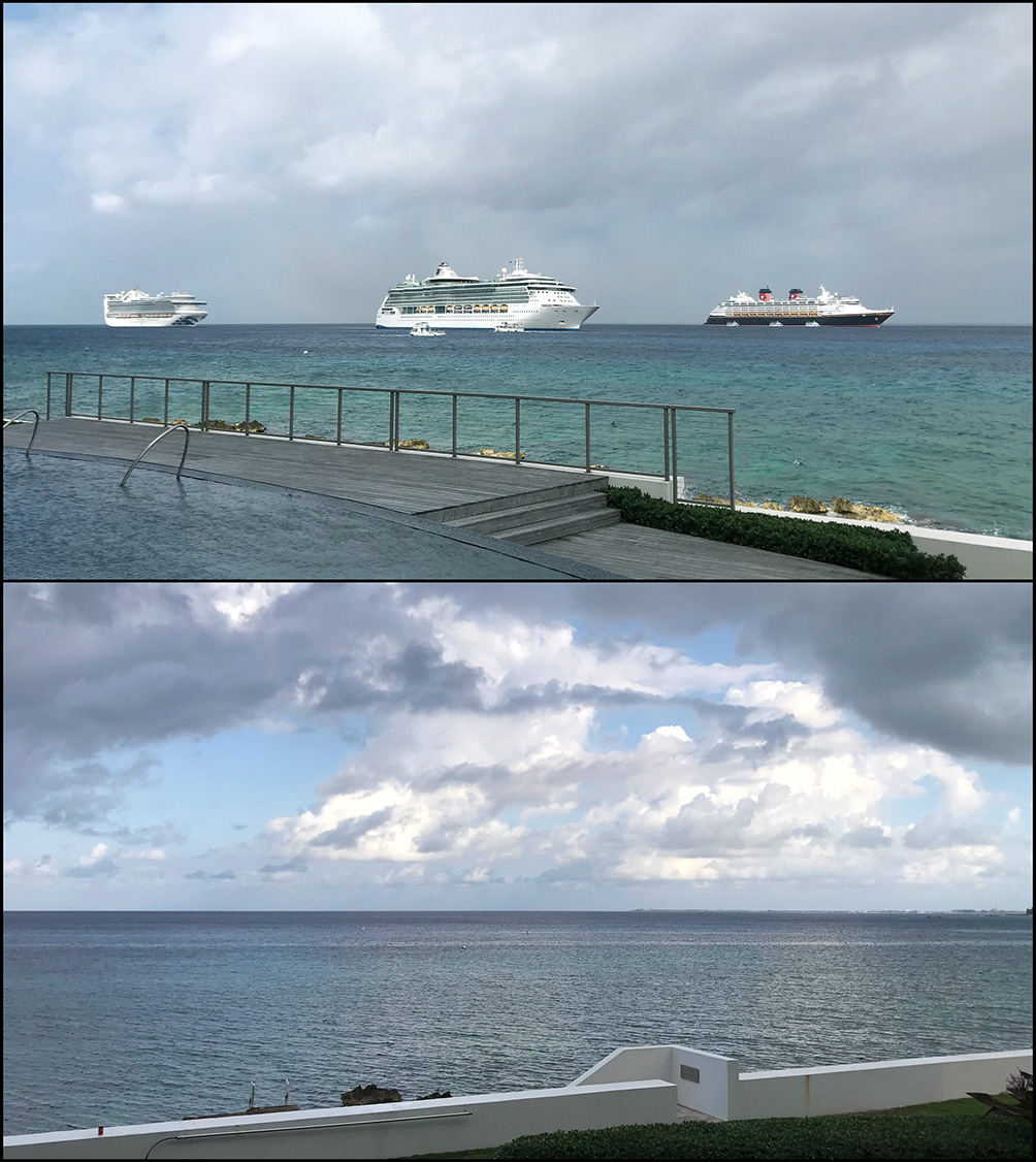 March 2020, we spent a week in Grand Cayman overlooking the bay at Georgetown. For the first four days, as many as seven cruise ships were anchored offshore, shuttling tourists to and from the port. The final three days, not a ship could be seen, not even on the horizon, as the island tried to escape the inevitable. We left just days before the airport closed.