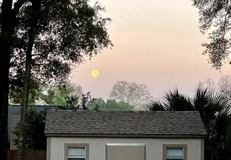Easter will be later this year than usual, and the photo holds a clue as to why. This setting full moon occurred two and a half days ago. Today is the equinox and also happens to be Sunday. If the full moon had waited three days to occur tomorrow, Easter would have been on March 27, a week from today. It didn’t of course, so actually Easter won’t occur until April 17, the first Sunday after the next full moon.
