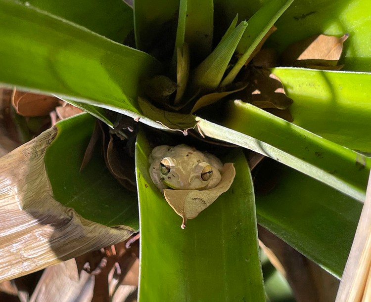 While tidying up our pineapple plot, we discovered this frog snugly resting on a leaf. These pineapple plants produce really delicious fruit, so this frog has a very sweet home indeed.
