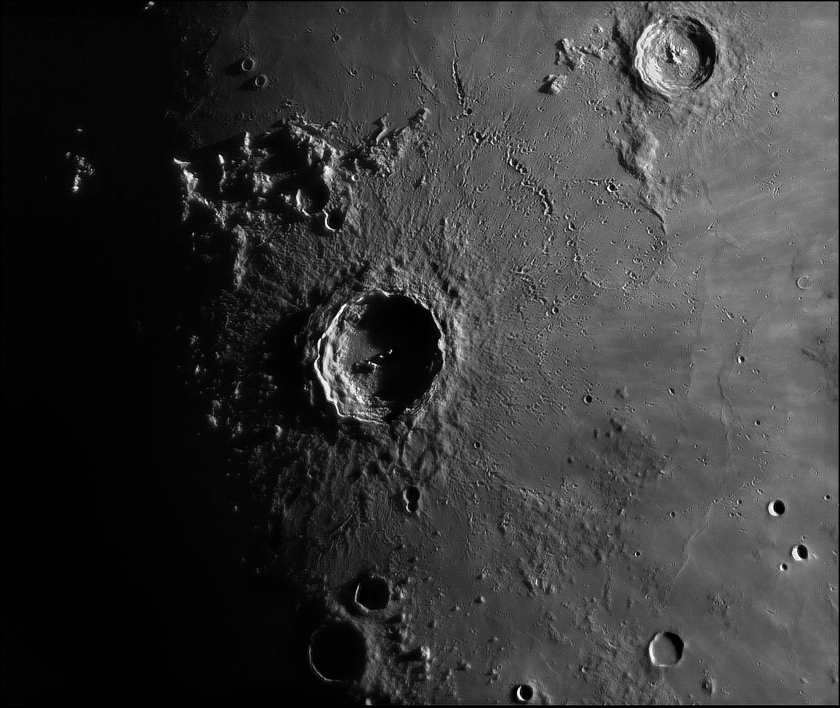 The 93-mile diameter crater, Copernicus, caught my eye the moment I looked at the Moon through my telescope two nights ago, and I just had to take this photo. The ragged rubble and distant pockmarks so clearly displayed in the lunar sunrise speak of the extreme violence with which a hypervelocity object struck the Moon eons ago to blast out this amazing crater.
