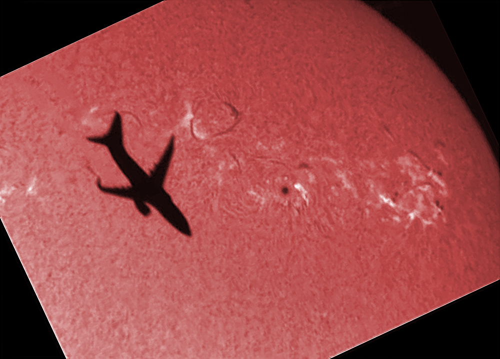 I was getting close-up images of the Sun in red, hydrogen-alpha light, when this airplane crossed through the field of view. It makes me wonder of the people on the airplane at the time and how they would feel to know that from my perspective they had had a “moment in the Sun.”