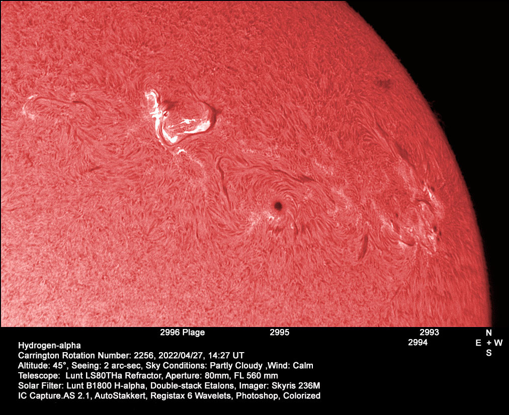 Sunspots with their magnetic fields are visible on the right of the photo with their NOAA numbers listed below the image. The spot near the center is larger than the Earth, and the bright area to the upper left of center (labeled 2996 plage) is a gigantic magnetic explosion that hurled high-energy x-rays and particles in our direction. These explosions can produce geomagnetic storms which can cause radio blackouts and can affect satellites. They can produce enough radiation to threaten the safety of astronauts but this one was not that dangerous.