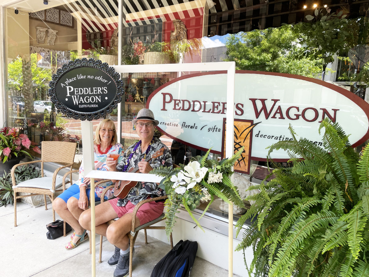 Fairy and I took a friend to the Peddler’s Wagon for shopping and fun yesterday. We all enjoyed the store for a while, then I went outside to play ukulele while the ladies continued shopping. A while later the proprietors came outside with a glass of punch and thanked me for the music. One offered to take a photo of Fairy and I, which we were happy to have them do. Great shopping and great service in a lovely setting, no wonder we like this place so much.