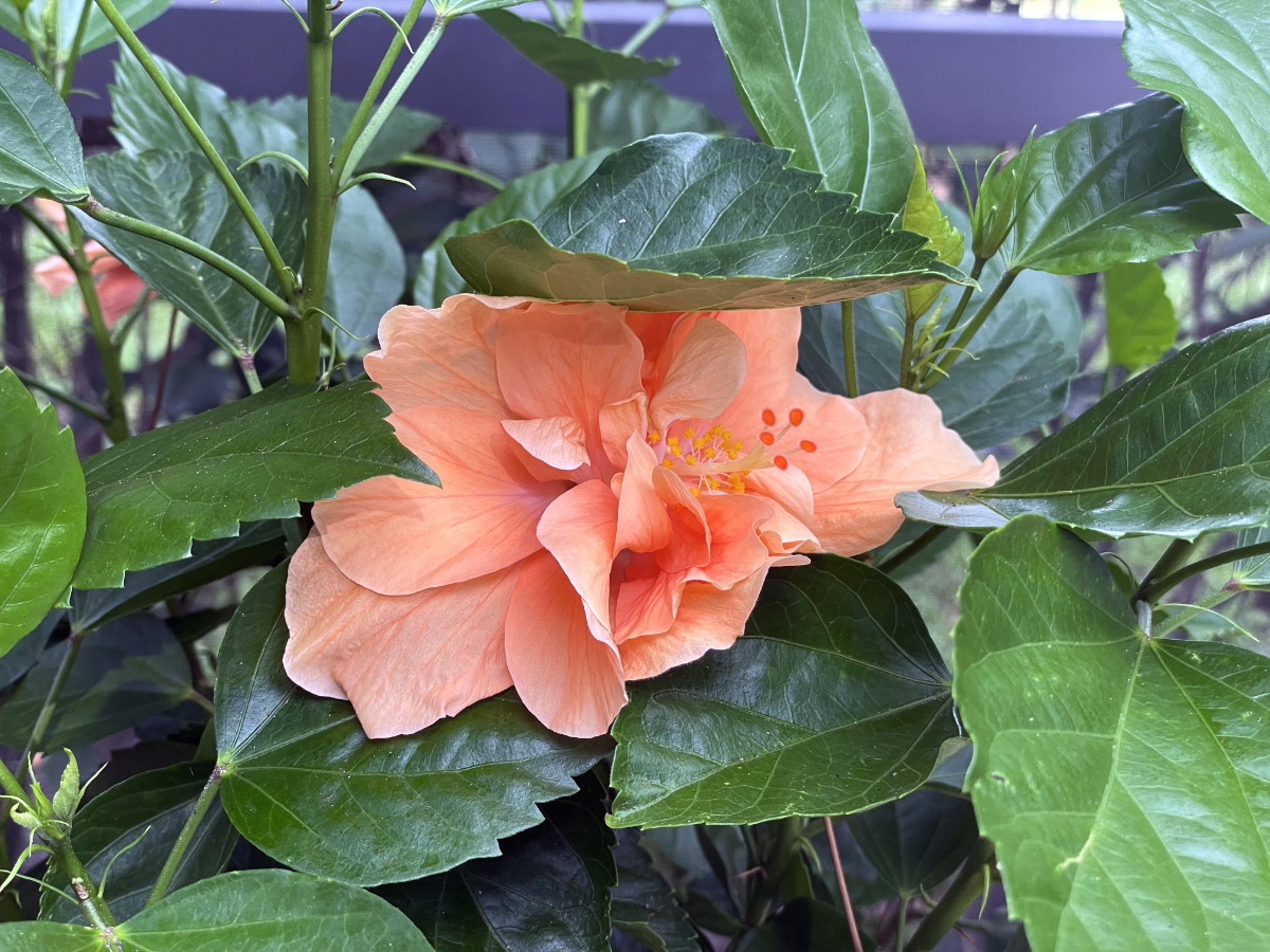 Tucked securely under a leaf, this double hibiscus was well protected from showers passing through and brightened our rainy day.