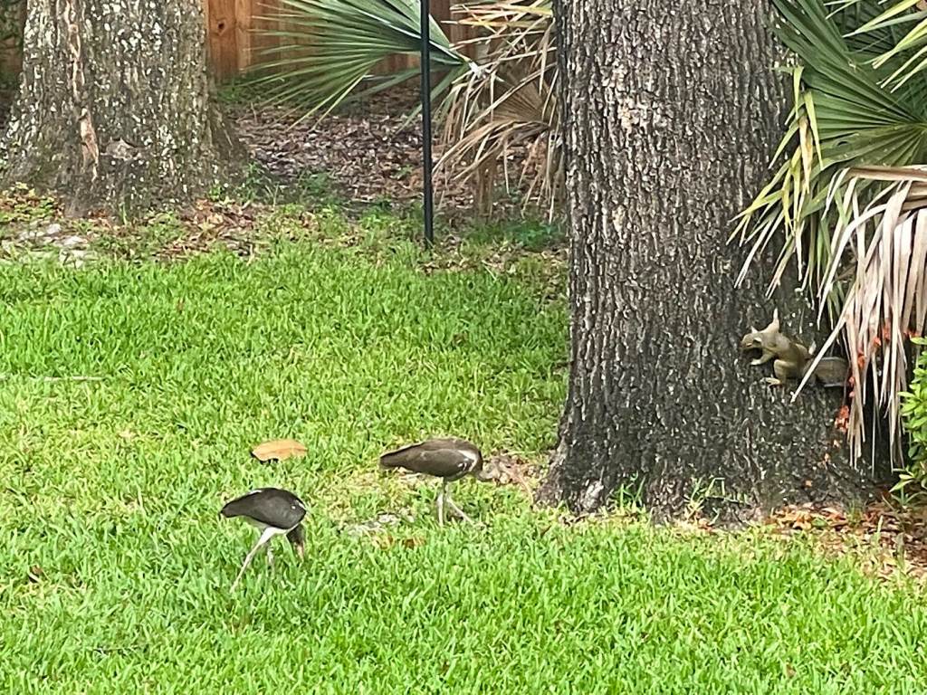 Immature Ibises and a Young Squirrel Vie for Dominance in the Back Yard