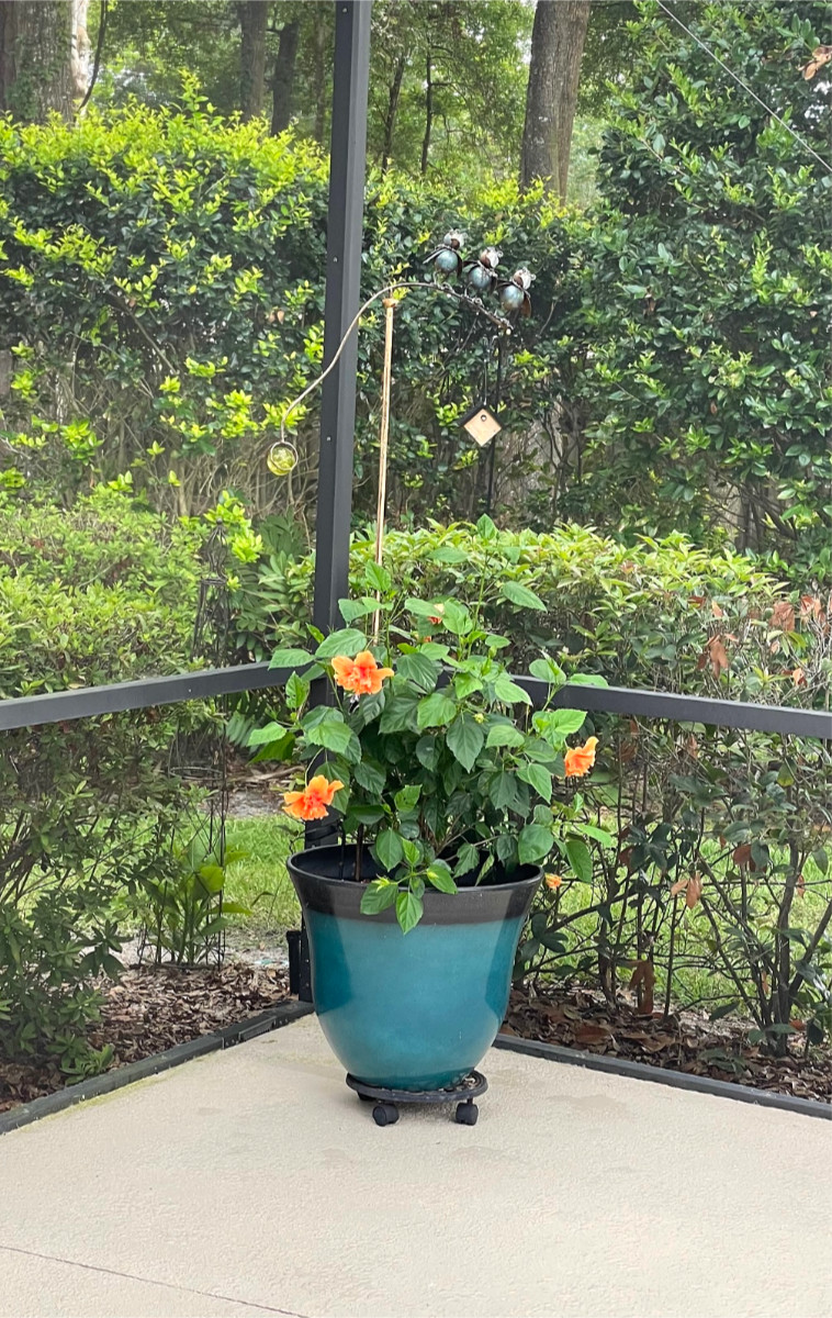 Three metal bird sculptures balance on a pole extending from a flower pot, which has three blossoms. In the background, a frog watches from the hole in a birdhouse, perhaps hoping to hear a melody so “pure and true.” On the other hand the three little birds are giving him their backside, so maybe his outlook is not quite so pleasant. Unfortunately, that has not yet persuaded him to seek a different residence.