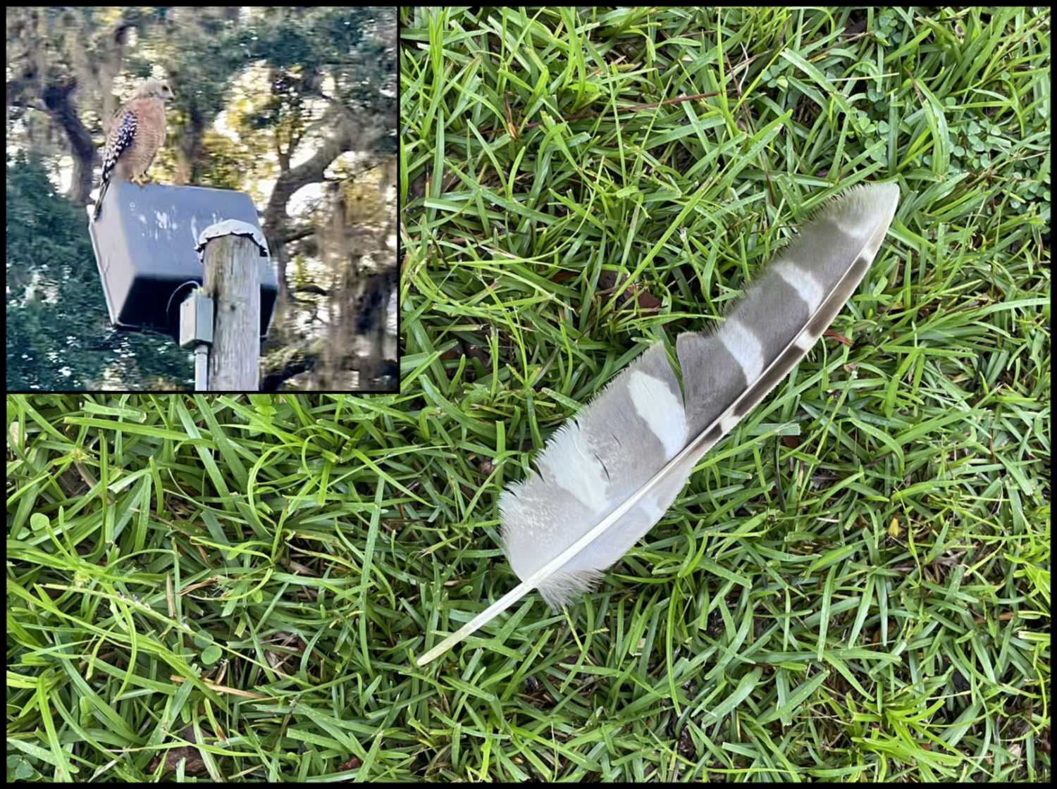 A couple of days ago on our morning walk one of the younger hawks rested calmly on the yard light as we passed by cautiously, and I took its photo without disturbing it. The next day this feather was found on the ground nearby. Whether it was from this hawk or from its sibling or parents matters little for they are birds of a feather, and in a small way it made us feel like family.