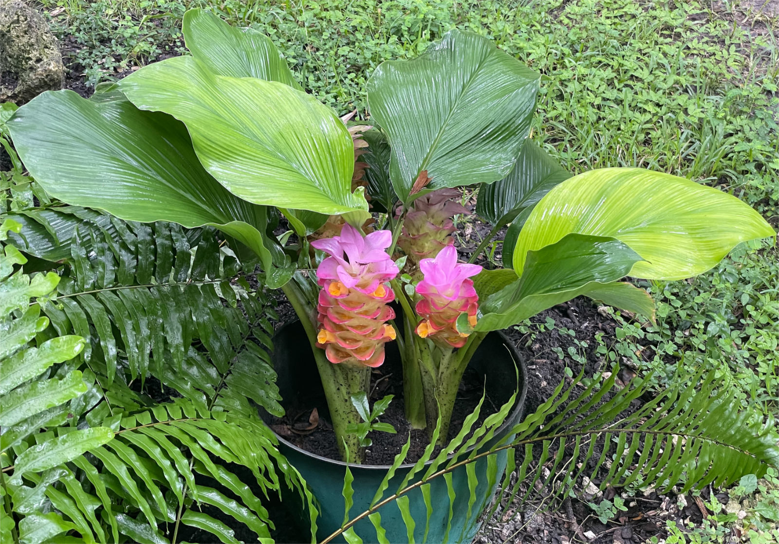Cradled in a pot beneath oak trees laced with Spanish moss, the ginger plant blooms brightly, watered by raindrops that are shattered into mist by the branches above. There it rests sweetly, gently.