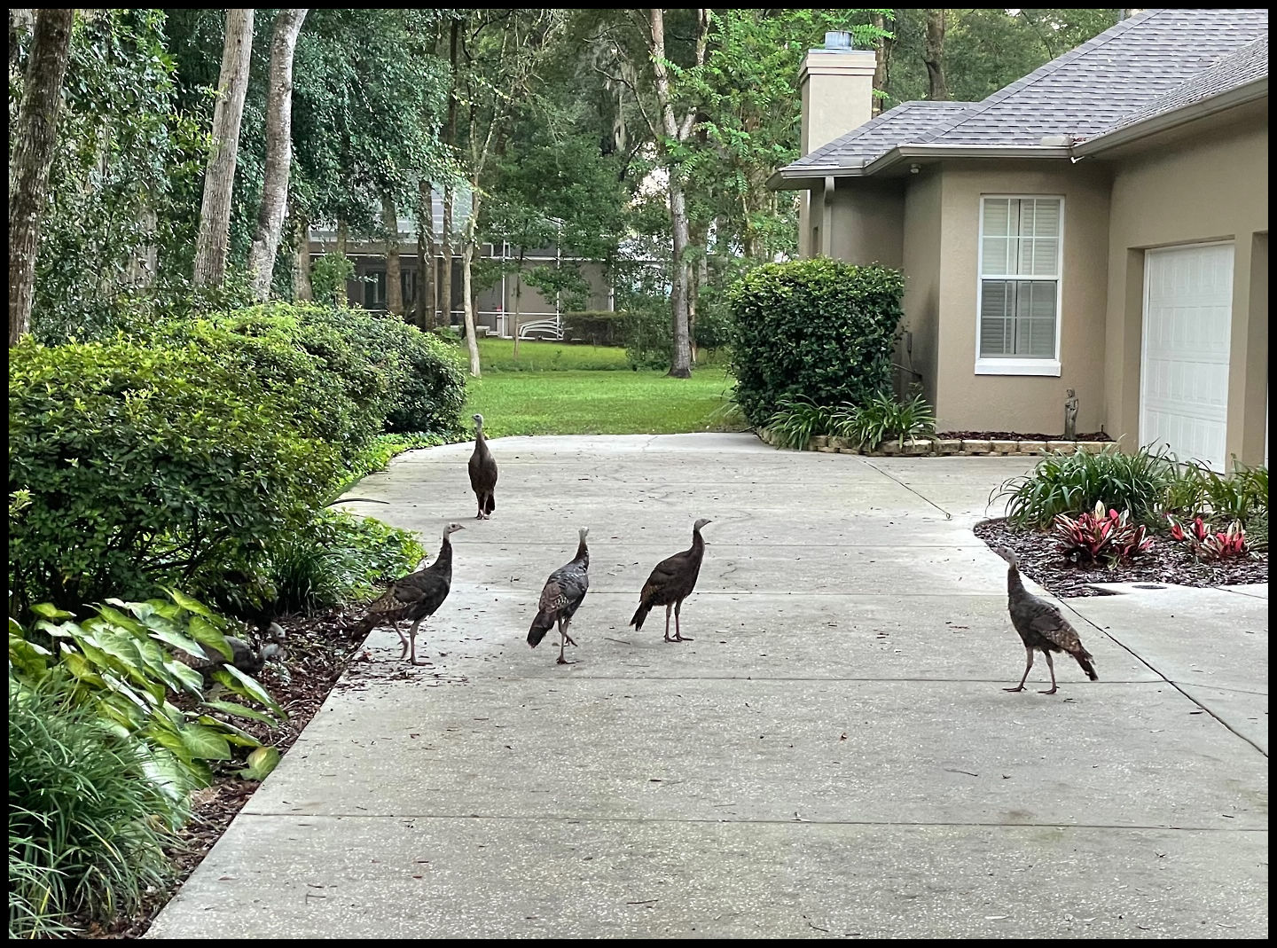 The woodland turkeys took a temporary turn towards civilization again. They show up now and then, little bothered by passers by. The matriarch keeps a wary eye out anyway while two of her clan are in the bushes on the left, scratching out breakfast.