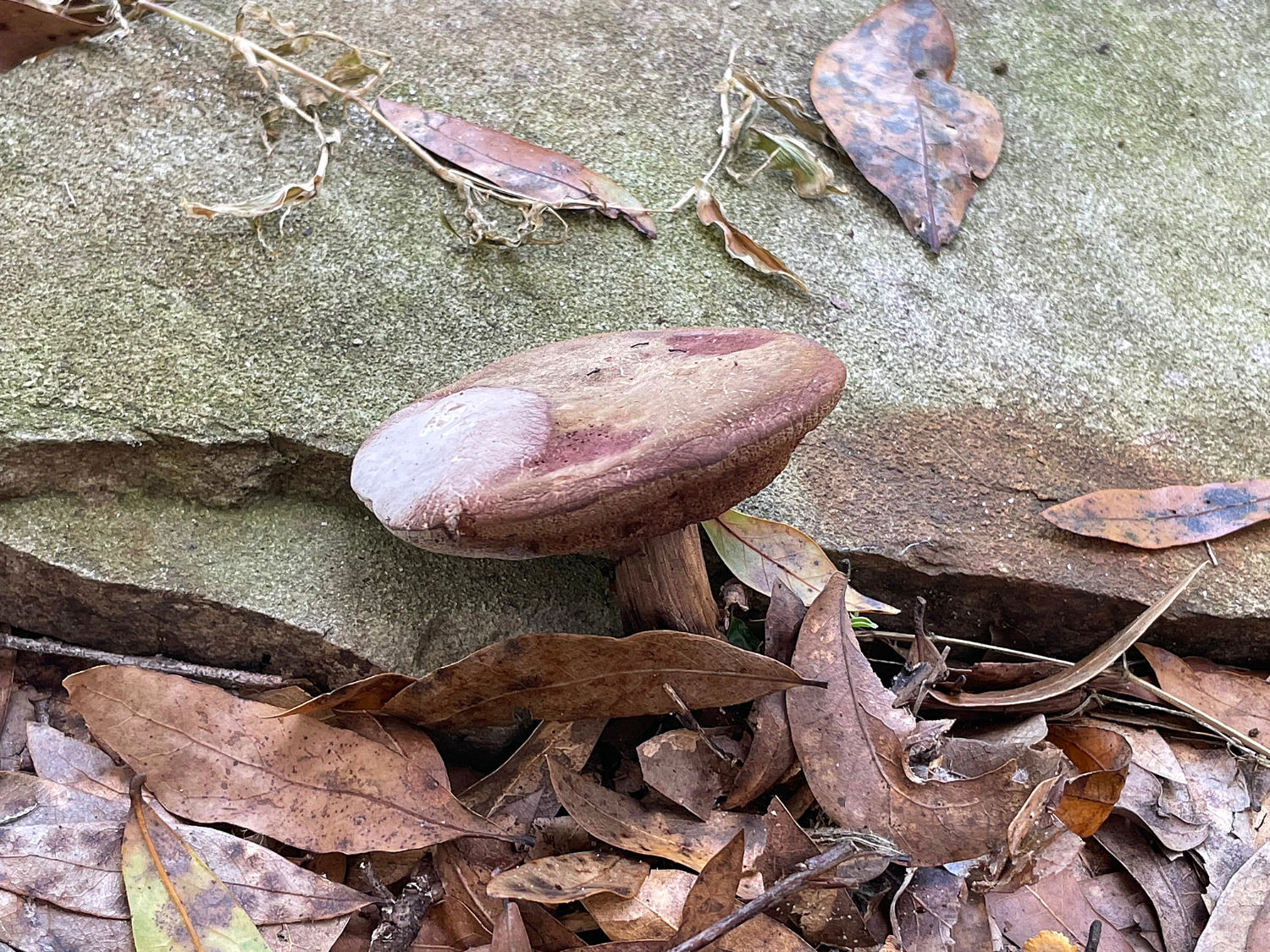 As I dropped some weeds on the compost area behind the shed, I saw a very strange “rock” next to a stone slab. Curious as to where it might have come from, I looked from a different perspective to discover that it was a toadstool, not a rock. Mystery solved. Now if I could just get that frog that occupies the birdhouse to come sit here instead…(see “Must You?” at https://wordpress.com/post/eskildoodle.com/2602)