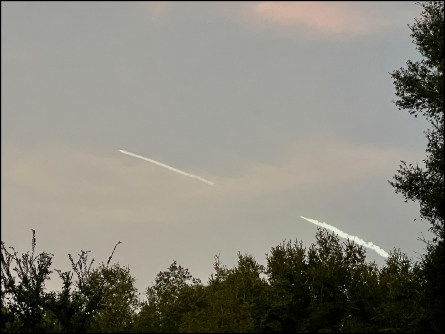 Recently, Fairy noted that a SpaceX Falcon was on its final countdown, and we watched the rocket ignition and then headed outside. Though it was over 100 miles away, the contrail and blazing rocket was clearly visible. The photo shows the gap in the trail between booster cutoff and second stage ignition. Both occurred as planned and a short time later the rocket was but a point of light fading far away into space.