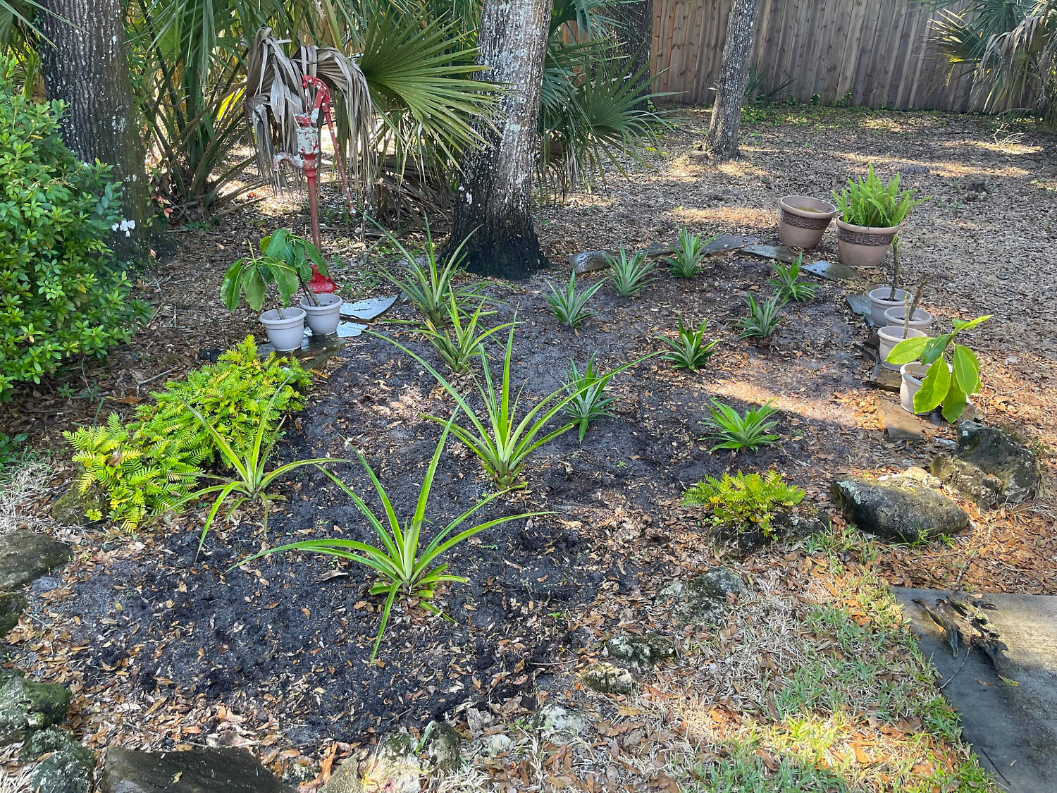 Our patch produced eight pineapples this year from plants that needed to be replaced at the end of the season. Those aged plants were replaced with the tops of their own pineapple fruits (the smaller plants towards the back of the patch). In a sense, the old plants were replaced by themselves, just like the old ones had replaced their ancestors in the past. They just keep growing, giving, and then regenerating once again in an amazing and delightful perpetual cycle.