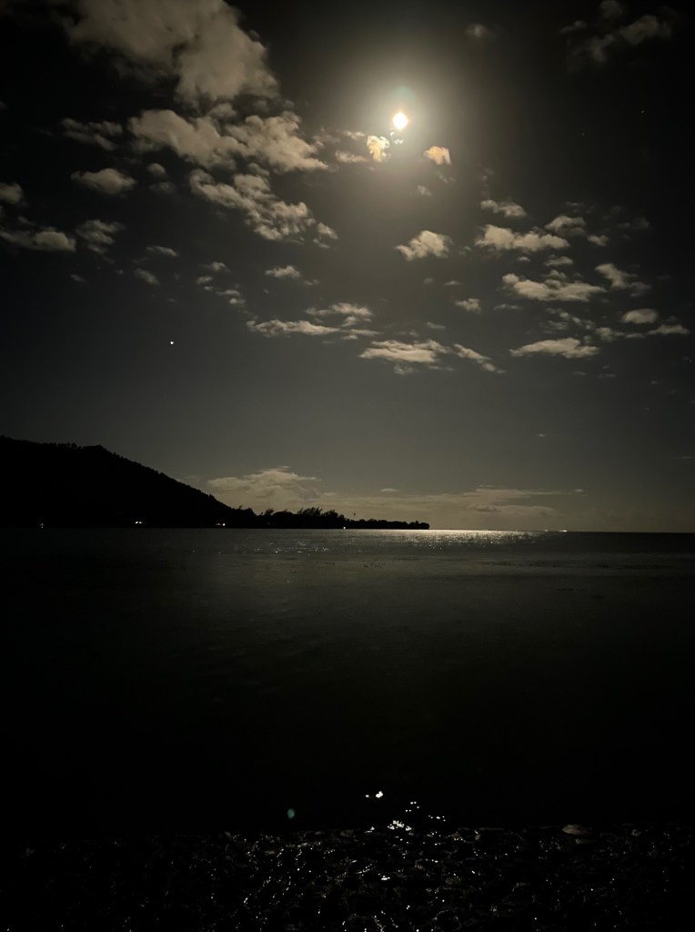 Awake at 3:45 AM, my body felt it was ready to go about the day. My jet-lagged mind reluctantly followed it out into the nighttime sky to view the Moon and Jupiter lowering over Cook’s Bay. Roosters crowed in the distance while breakers crashed on the outer reef, serenading the serenity of the scene. After a brief discussion, the bewildered mind finally convinced the the body to go back to bed to try and sleep a little longer, but both had to admit that the interlude had been well worth it.