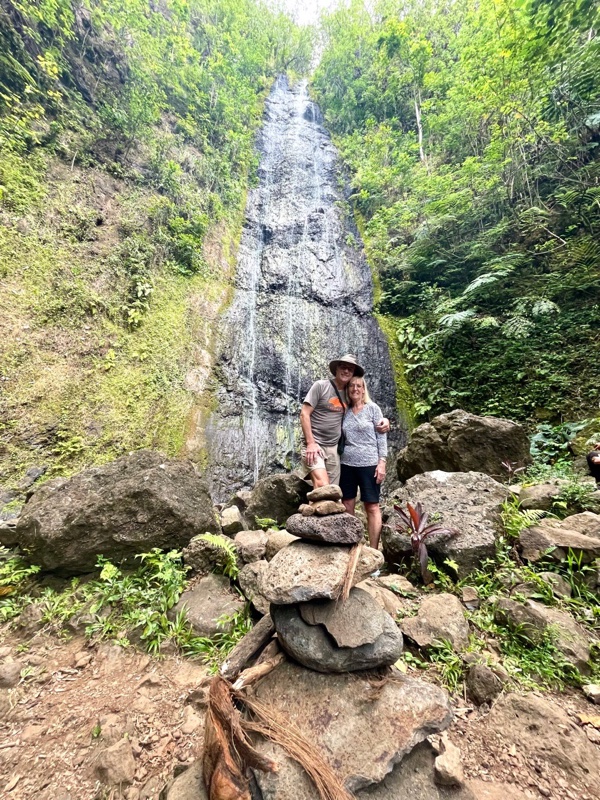 We paid our respects to the face of the ali’i carved in stone at the base of the waterfall, then sat with our feet in the cool water of the pool below the fall and admired the serenity of the scene. A sacred eel with piercing blue eyes swam sedately by, pausing to look directly at us both with reassurance that we were welcome, and the assurance of a safe return home.
