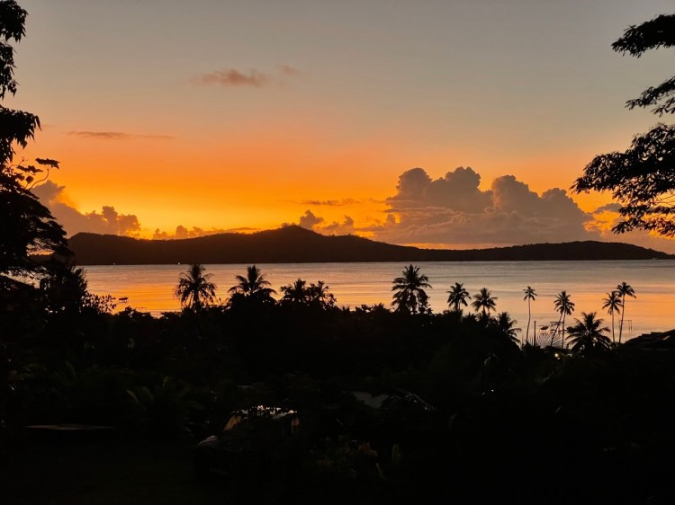 The Sun has set, but our stay here has just begun. We’re settled into our bungalow at Rohotu Fare, and just dined at Bloody Mary’s restaurant. I had their namesake drink, and while it was good, I don’t think anyone will ever match what I call “Karen’s World Famous Bloody Mary!”