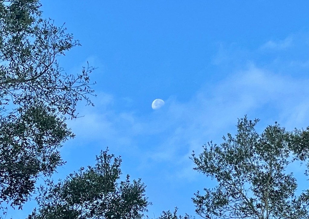 An approaching cold front provided begrudging looks at the gibbous Moon this morning. Shortly after this photo was taken, the Moon disappeared as if eaten by a dragon, not the fire-breathing type, but one with a cold heart.