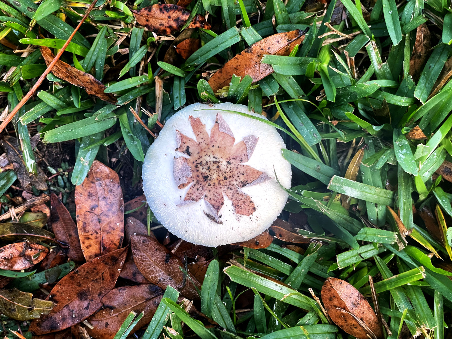 This mushroom seemed to be trying to blend in with the leaves until its white cap burst forth from beneath its brown veil whose tattered remnants resemble a starburst. A day or two later it was all gone, nothing left but the grass and leaves and the fungal filaments beneath the ground from which the “shroom” sprouted.