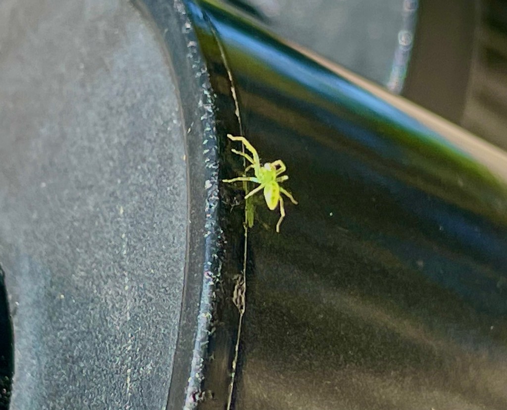 At the end of my solar observation session yesterday, this green spider appeared on the lens cover. While green is assorted with envy in people, I know not if that applies to spiders, however, it does little to camouflage it on the black telescope.