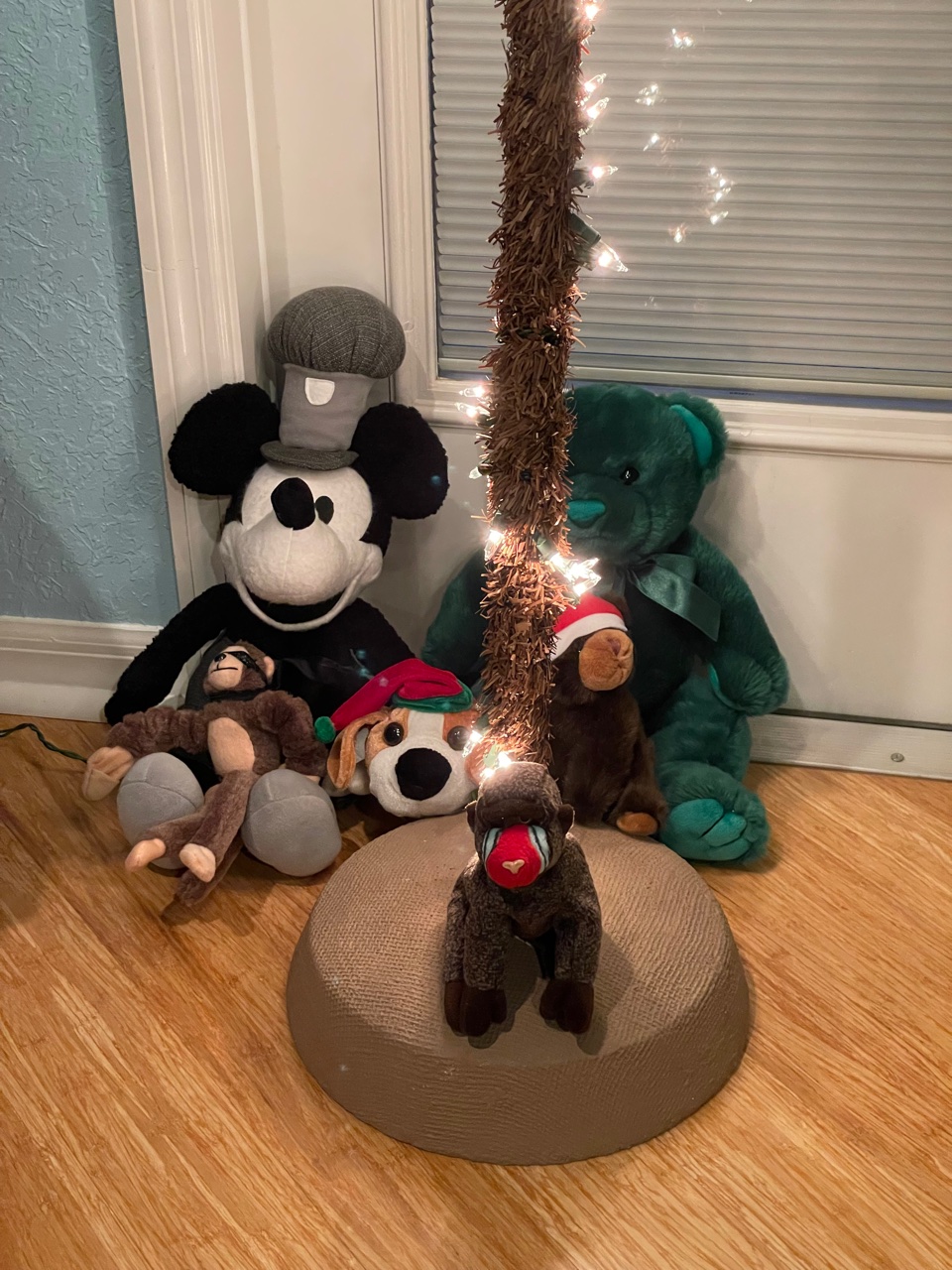 The decorations are up and the stuffed animals have gathered under our lighted palm tree, a fitting symbol of our Florida climate. This includes the infamous flying super-monkey that soars through the air and lands with a cacophony of primate calls. It was a gift from someone who will remain anonymous, but its aerial antics have gotten me into more than just a little bit of trouble. Thanks a lot, Linda!