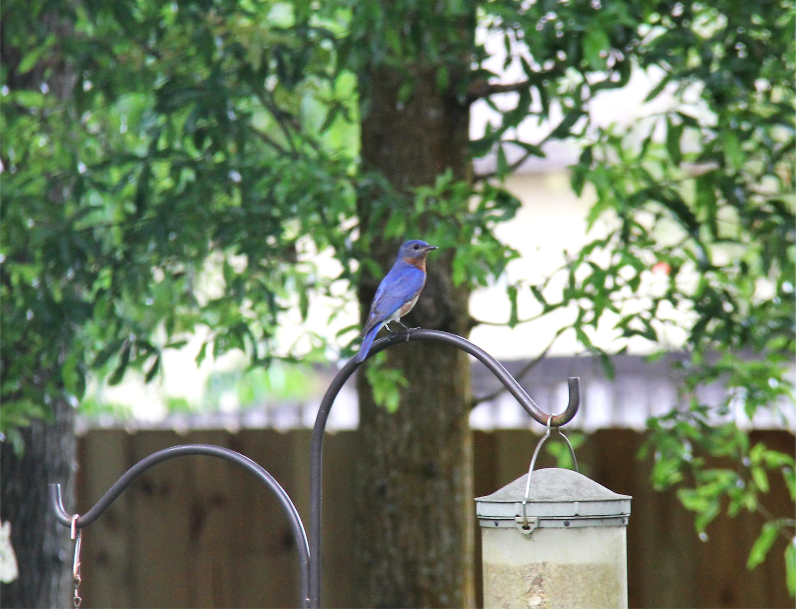 On our morning walk we saw a bluebird, much like this one, perched on a streetlight in the full sun. Its iridescent blue back was towards us at first, and as we admired its stunning color it turned part way to reveal its dark red chest and light belly as well. Perfectly posed to reveal its full glory, it remained stationary for as long as we chose to admire it. How long we lingered I don’t really know, for it radiated the kind of blues that warmed the heart and made time meaningless.