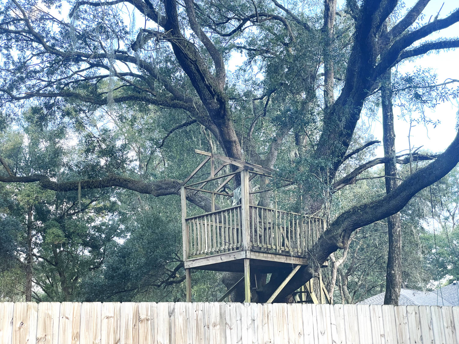 Once, kids played in the treehouse built in a large oak tree. A blue tarp kept off the rain while they imagined adventures high above the ground, safe from crocodiles, hooligans, and pirates, and out of range of parents and teachers. Summers and winters came and went, the toys began to disappear, the treehouse seemed to shrink as the kids grew larger, and the tarp became ragged and finally disappeared. Visits up the stairs to the structure became less and less frequent. Now the kids have grown, Tinker Bell has flown, and nature is slowly reclaiming its own.