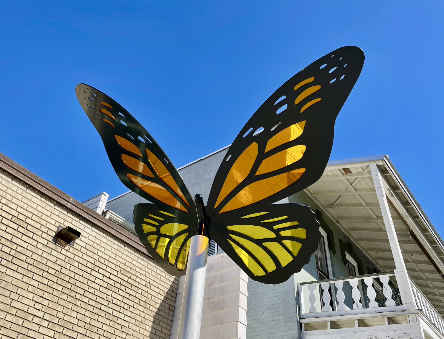 Mounted on a pole, this large, winged marvel hovers over the sidewalk setting pedestrians aflutter.