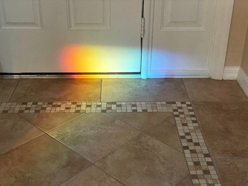 The winter sun is slowly shifting northward again and in the process produces curious late afternoon light shows that vary daily. Its setting rays recently passed through the windows and through a pane of glass that painted this rainbow on the doorway. With a little effort I might have been able to identify the source of this prismatic effect, but I didn’t even try. Sometimes beauty only needs to be appreciated, not explained.