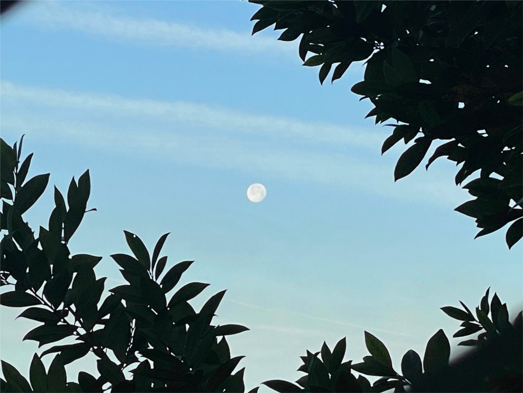 It hovered in the morning sky, the Man on the Moon seeming to grin down towards Earth just as it was about to set. The Moon was full just two days before but still looks nearly round in its gibbous phase, the phase between full and quarter. Maybe it has a secret that it would love to share, but is just too shy or maybe too tired after illuminating the sky all night. Yes, that must be it, tired with his head is on its side, ready to nap.