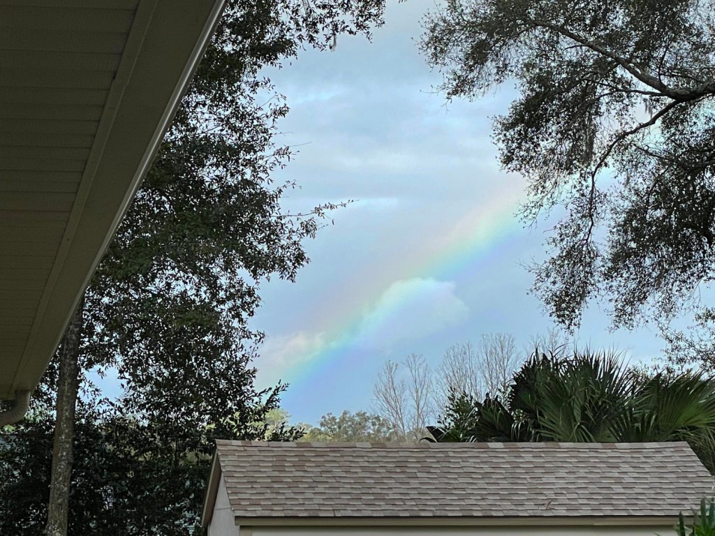 A neighbor took pity on our plight and offered a ride home, which we eagerly accepted. As we were unlocking the door to our garage, this rainbow appeared. We had curtailed our walk early and the rainbow seemed to be signaling: “Good idea!”