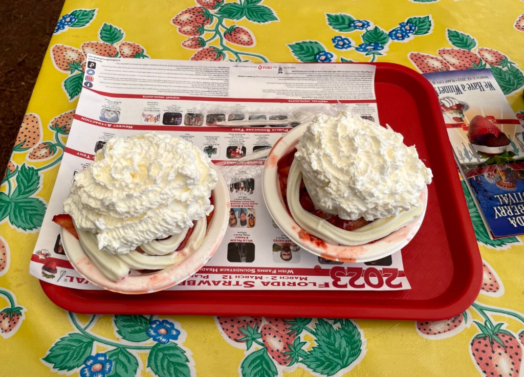 The strawberries are in season, so we went to Plant City, Florida, for our annual shortcake dessert. The strawberries were not quite fully ripened, however, so they lacked some of their usual great taste. Fortunately, the shortcake and ice cream made it better, and of course it did help that the berries were buried in whipped cream.
