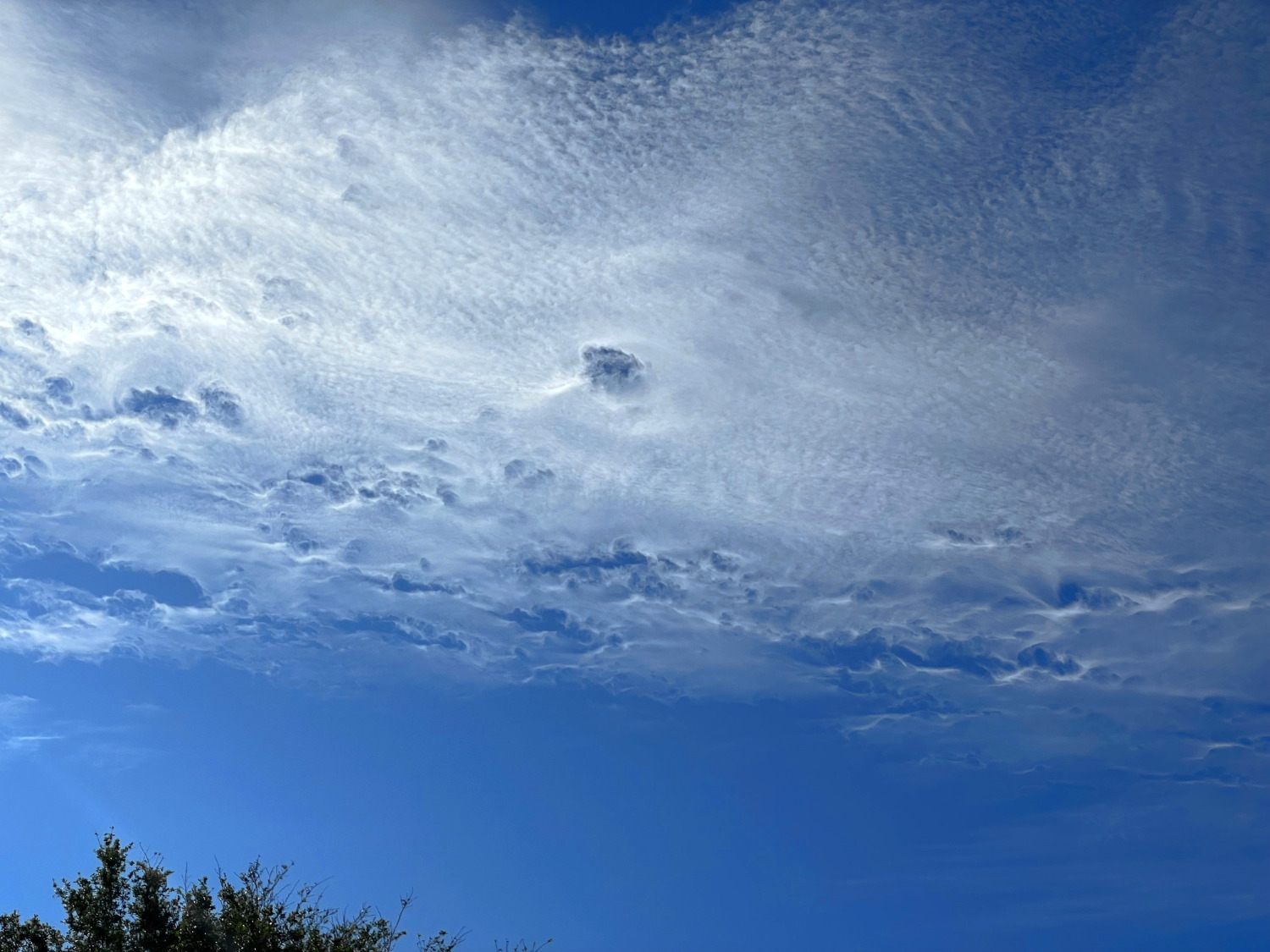 This cirrus cloud appeared yesterday, punched full of holes like Swiss cheese, by aircraft traveling along routes to Tampa, Orlando, or Miami. As they passed through the clouds, their wings created a spinning wake, like miniature horizontal tornadoes, that tore holes in the clouds and left a confused pattern behind. Clearly this was another busy day for air travel.