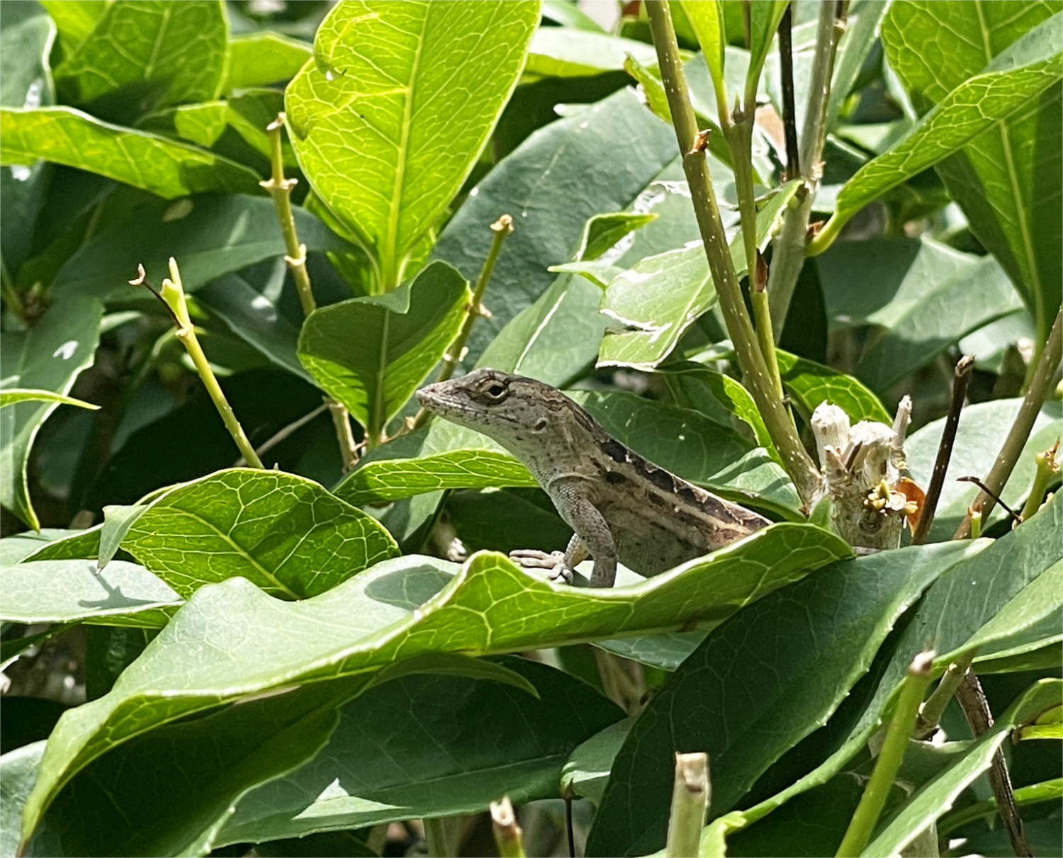 It watched warily from its leafy perch. Perhaps it had been stalking insects for sustenance while its eyes were also searching for signs danger and the threat of becoming a meal. Or maybe it was just camera shy, for shortly after this photo was taken, it disappeared into the tangle of leaves. Either way, it turned out to be an object of delight for a curious camera bug, who just wanted to capture the scene, not the being.