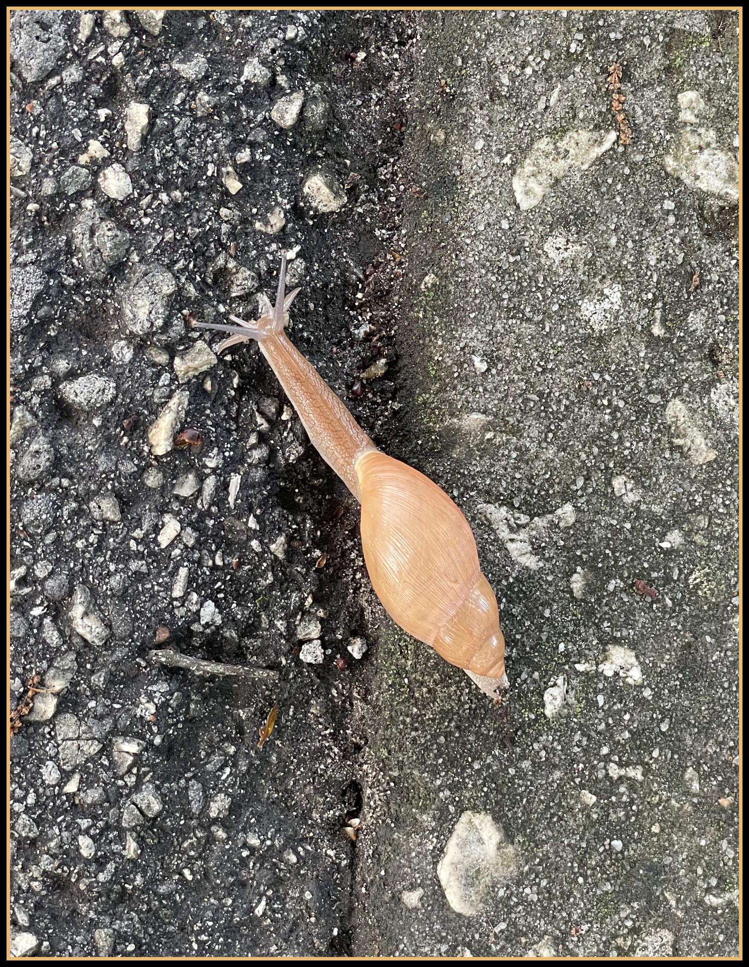 This creepy little slimer with the thin shell appears to be contemplating crossing the street. I really wouldn’t recommend it since per Wikipedia, they have an average speed of about 0.03 MPH with a record speed nearly double that held by “Archie,” who did 13 inches in 2 minutes decades ago in England. Besides he’d have hardly enough mucous to make it all the way, even if a car didn’t get him first.