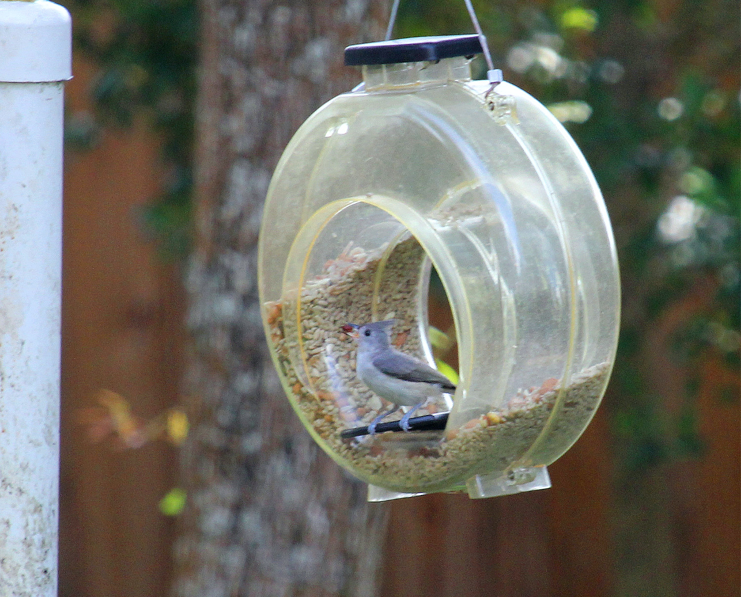 I had work to do in the yard; fertilize some plants, water a dry area, put fresh water in the birdbath, and finally, replenish the bird feeders. It sounds simple, but the feathery fiends kept diving to the feeders, and I felt obliged to wait until they finished. Finally, there was a break, and I got all of it accomplished and just in time. Soon the titmice, cardinals, chickadees, and even a woodpecker were back jostling one another again and bringing their appetites with them. However, it was this titmouse that stole the show.