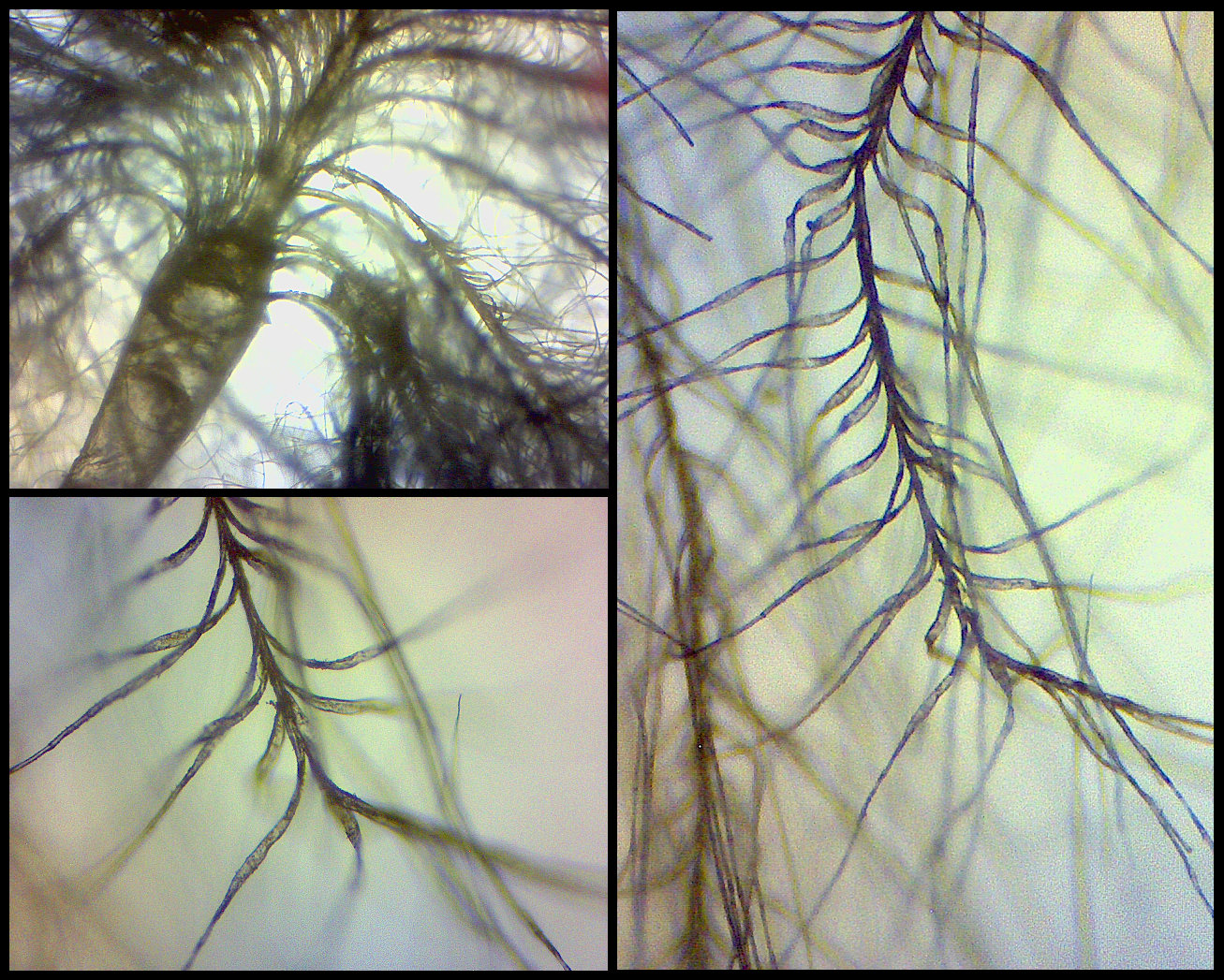Squeaky chirps from atop a dead tree betrayed the presence of several swallow-tailed kites, probably adults and offspring. It came as no surprise since they frequent the area; but a bit of fluffy down on the pavement did arouse my curiosity. Likely it came from one of the raptors high above, and I wanted to see how it appeared through a microscope.