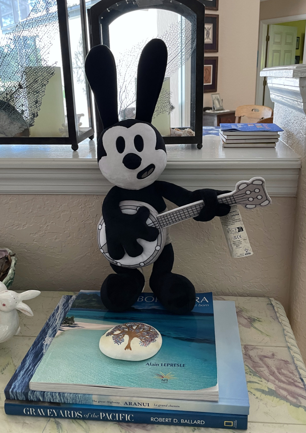 It was a long time coming; created in 1927 by Walt Disney and Ub Iwerks for Universal Pictures, Oswald the Lucky Rabbit was controlled by Universal from 1928 until 2006 when the Walt Disney Company negotiated the return of the rights for Oswald. In the meantime Disney created Micky Mouse as the replacement. Mickey was much luckier than Oswald and brought much needed luck to Walt Disney as well. Oswald may be a little envious of his successor but they do seem to get along in our house as long as I keep them in separate rooms. Of course it helps that we both play the banjolele. Thanks Emily and Jon.