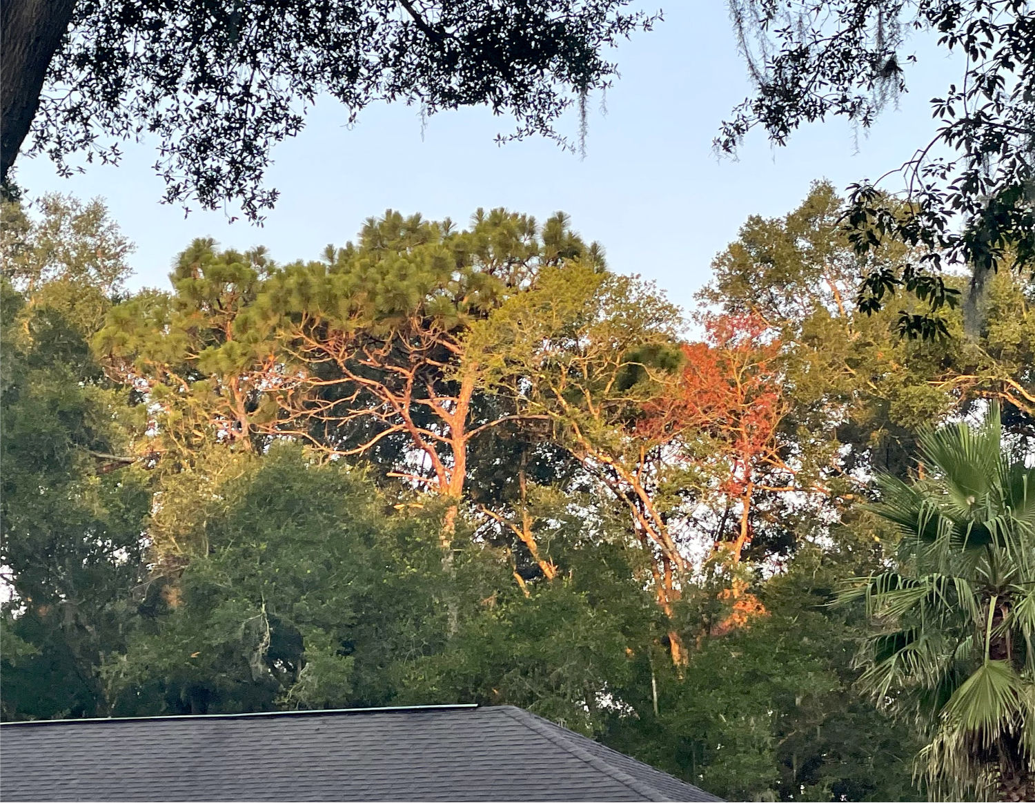 Horizontal rays from the Sun poked through gaps between other trees to brighten branches that seldom see direct sunlight. ‘Twas a happy thought to start the day.