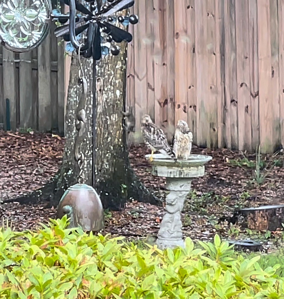 Two juvenile red-shouldered hawks in the birdbath were caught eyeing a bold squirrel racing up a tree just a few feet away. The video from which this still was captured shows several squirrels racing up, down, and between trees. The squirrels were quite aware of the young hawks and seemed to be playing their own version of “slapping the bull.” They may be getting away with it for now, but for how long?