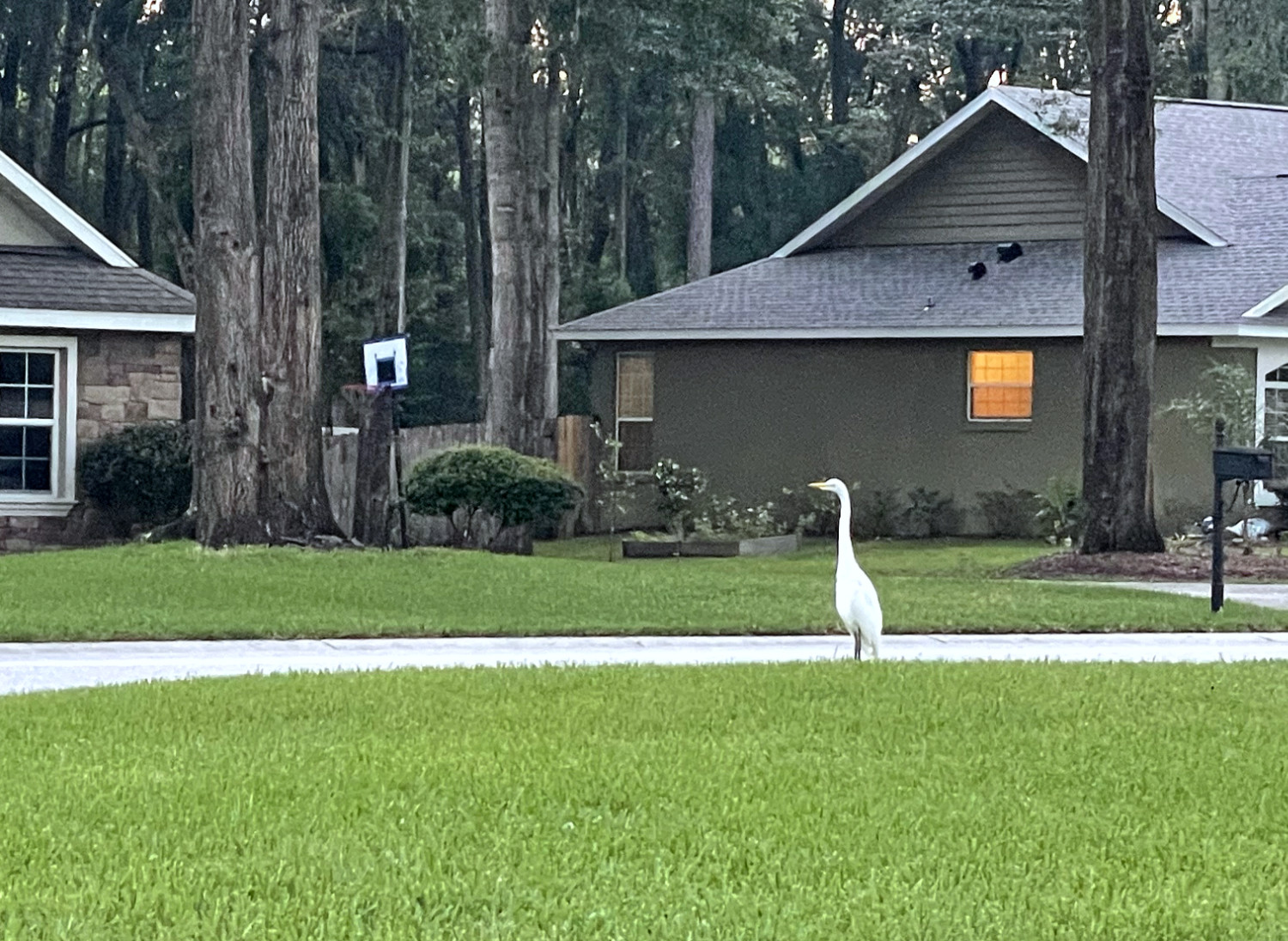 We see many birds in our neighbor hood including hawks, whistling ducks, ibises and more, but this is the first great egret we recall seeing on the ground here. Usually they are found close to water or swamps, hunting for food. Perhaps it thought the ibises were on to something; plenty of lizards, insects, and other food, but no alligators that might turn him into food. I don’t know, but it was another happy sighting during our morning meanderings.
