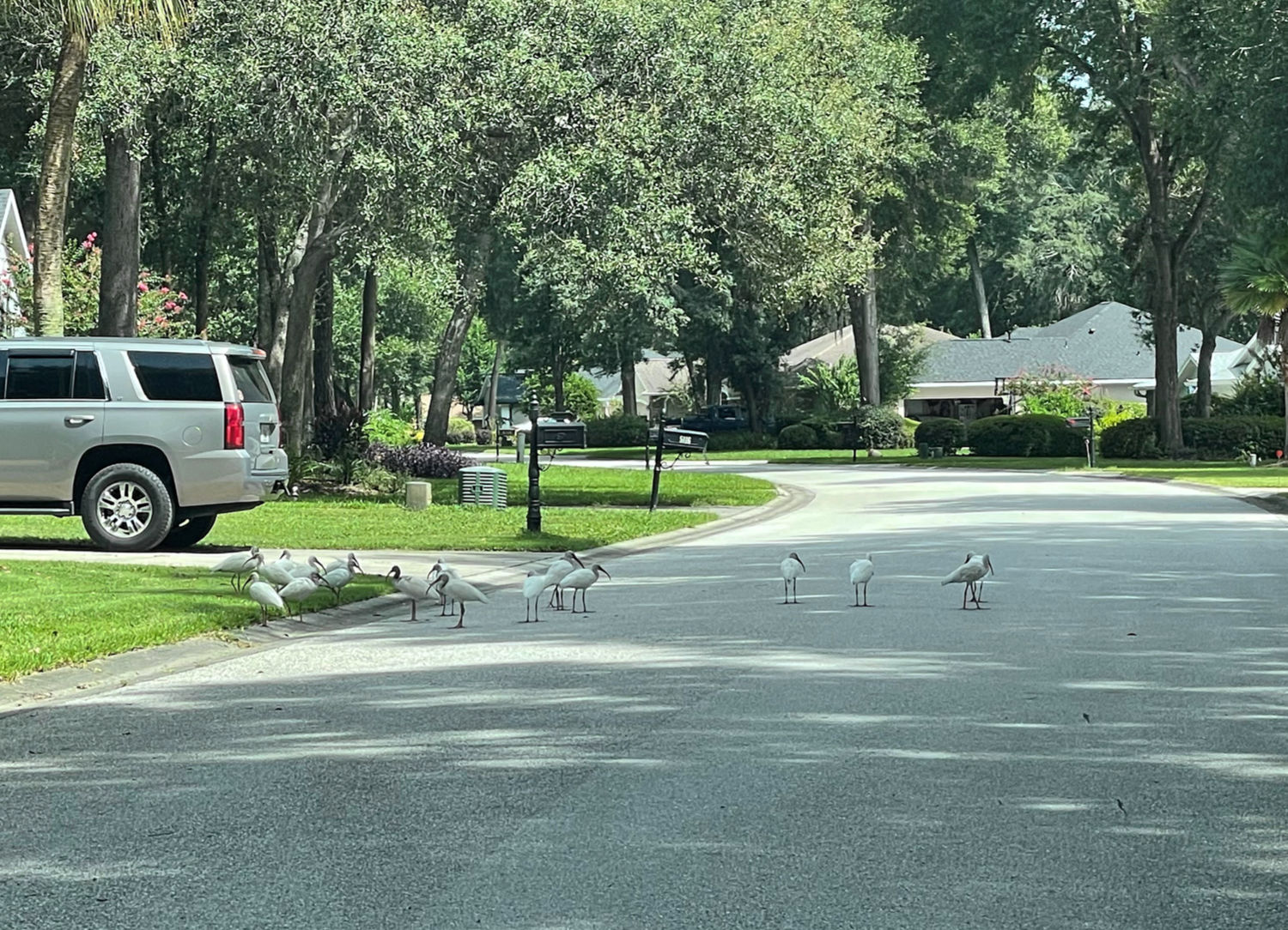 “How neat!” we couldn’t help exclaiming as we neared this feathered flock of not-quite-mature ibises. They seemed to be in the middle of a 50-meter mosey across the street to the next yard. We slowed the car to nearly a crawl, and they ambled over to the left side of the road to let us pass.