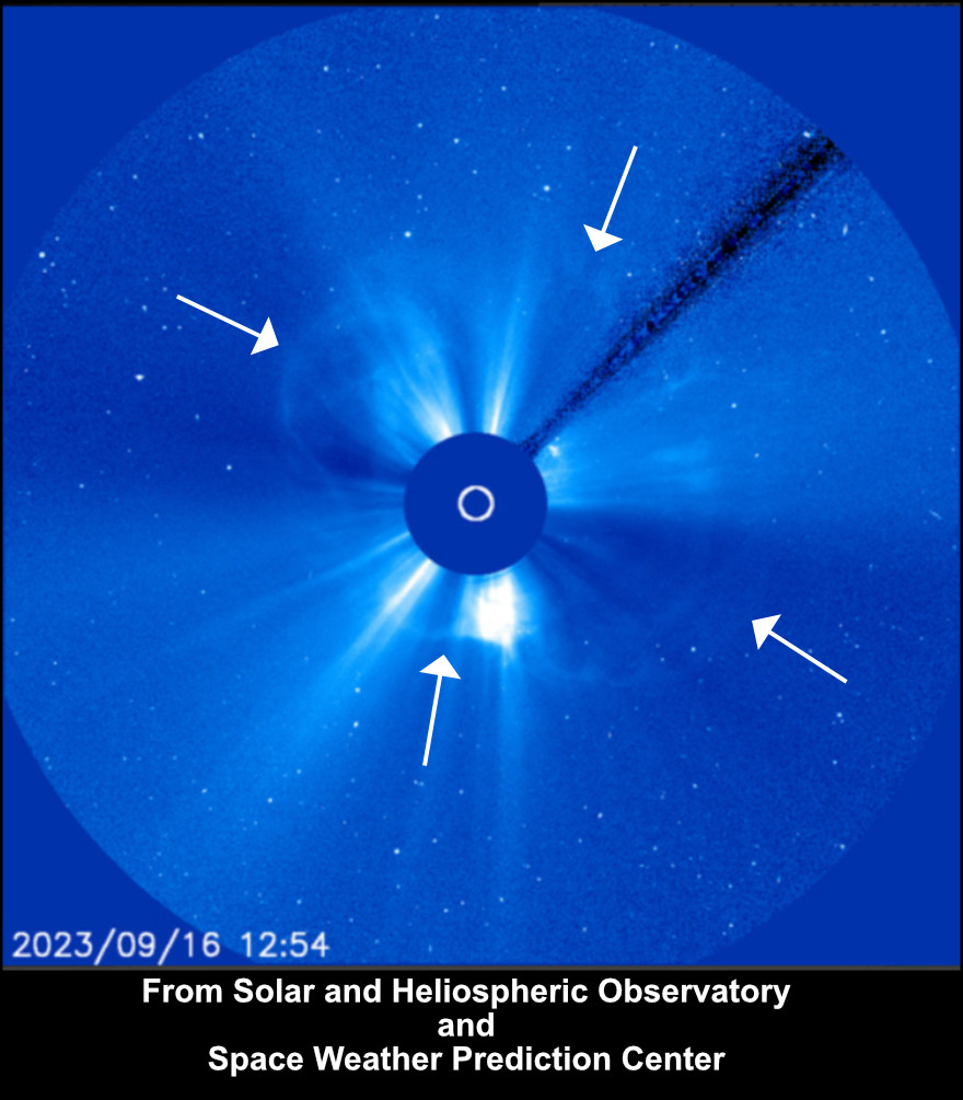Since the satellite that took that image is between us and the Sun, the ever-enlarging halo means that part of the material ejected is going to strike and distort earth’s magnetic fields. That may produce some increase in northern light activity that could be visible from the northern continental US, and may affect some radio comunications. Otherwise this one is not expected to have much effect on earth, but in the past more powerful CME’s have had serious effects on the satellites and on the power grid. This why we keep watching in hopes of getting some prior warning if and when another “big one” is on its way.