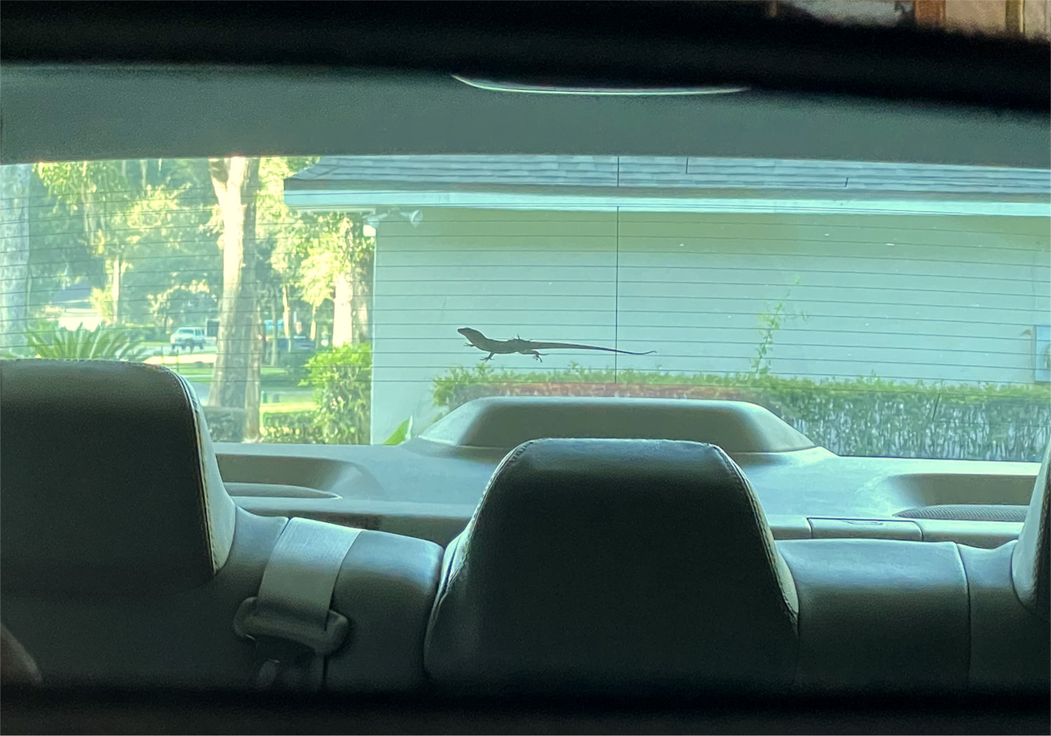 I glanced at the rearview mirror while backing out of the garage and discovered this lizard clinging to the back window. Perhaps it was lucky to be aboard for it was a ticket out of the garage where it likely would either starve or dehydrate into a mummified corpse. On the other hand, it was on a moving vehicle that could take it to who knows where, and it quickly scampered out of view.